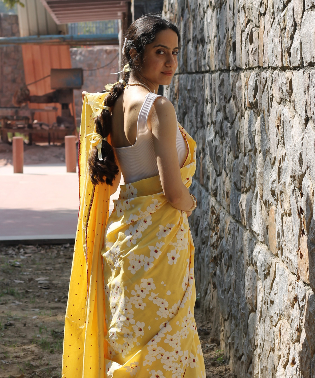 Yellow summer child block printed mulmul saree