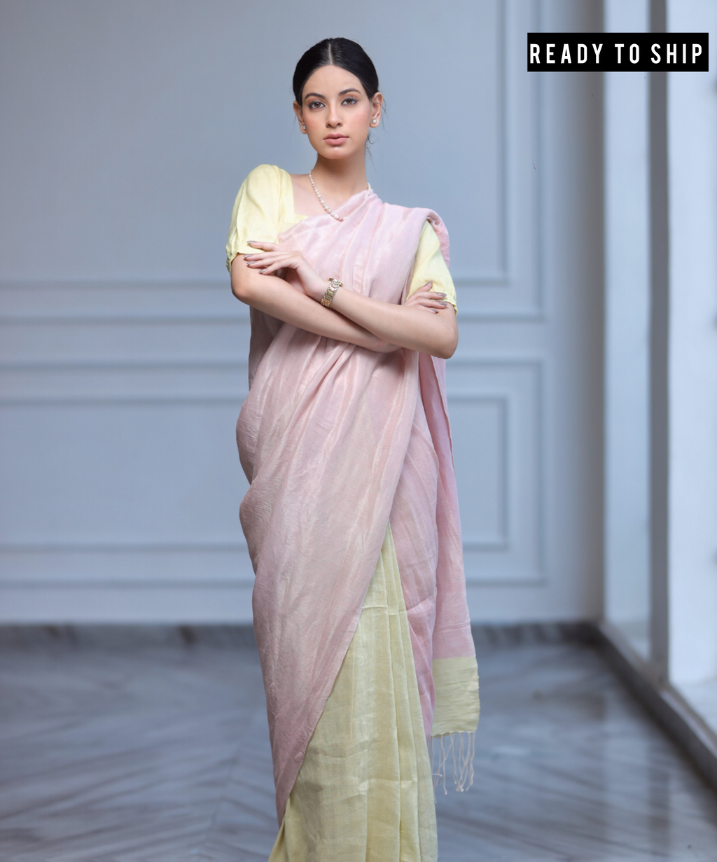 Pink yellow linen zari saree