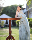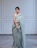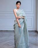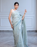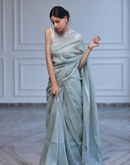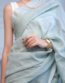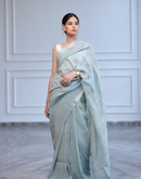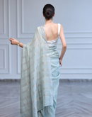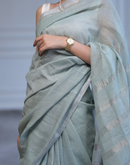 Handwoven linen saree crafted in mint colored base with silver zari border and striped aanchal. This saree is handwoven by women weavers from Phulia, West bengal.
