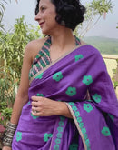 Perfect for the festive season, this purple dyed chanderi silk saree has been blockprinted using the traditional technique. This saree is detailed with lace on all borders to add the festive style.