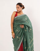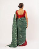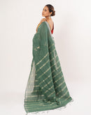 Handwoven linen saree crafted in dual tones of green and maroon color with silver zari border and striped aanchal. This saree is handwoven by women weavers from Phulia, West bengal and is embroidered by our in-house team of artisans.