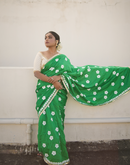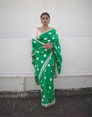 Perfect for the festive season, this green dyed chanderi silk saree has been blockprinted using the traditional technique. This saree is detailed with lace on all borders to add the festive style.