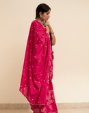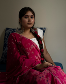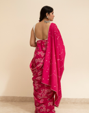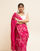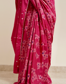 Perfect for the festive season,this floral pink mulmul cotton saree has been blockprinted using the traditional technique. This saree is detailed with lace on all borders to add the festive style.