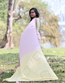 Pink yellow khadi cotton saree hand blockprinted using abstract blocks.