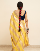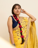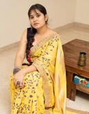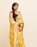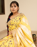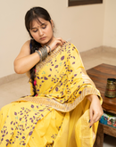 Perfect for the festive season,this yellow mulmul cotton saree has been blockprinted using the traditional technique. This saree is detailed with lace on all borders to add the festive style.
