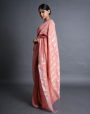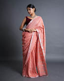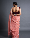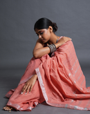 Handwoven linen saree crafted in festive peach hues with silver zari border and striped aanchal. This saree is handwoven by women weavers from Phulia, West bengal.