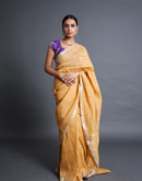Handwoven linen saree crafted in festive yellow hues with silver zari border and striped aanchal. This saree is handwoven by women weavers from Phulia, West bengal. Saree length- 5.5 mtrSaree...
