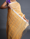 Handwoven linen saree crafted in festive yellow hues with silver zari border and striped aanchal. This saree is handwoven by women weavers from Phulia, West bengal.