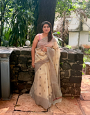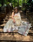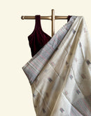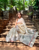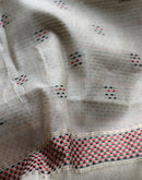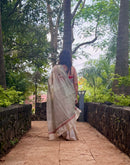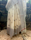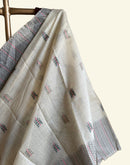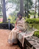 This breezy off white cotton chanderi saree with multi color kantha stich technique is a no brainer saree. It compliments for an office meeting to an evening gathering. The saree highlight the beauty of minimal yet effective design.