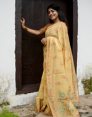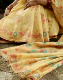 This beautiful yellow cotton chanderi jamdani saree have beautiful floral story all over its surface. The border also has a beautiful intertwining floral design, The saree is a beauty not to be missed. It is airy and allows unhindered functionality.