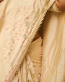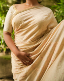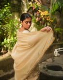 Perfect for the festive season, this golden beige chanderi silk saree has been blockprinted using the traditional technique. This saree is detailed with lace on all borders to add the festive style.
