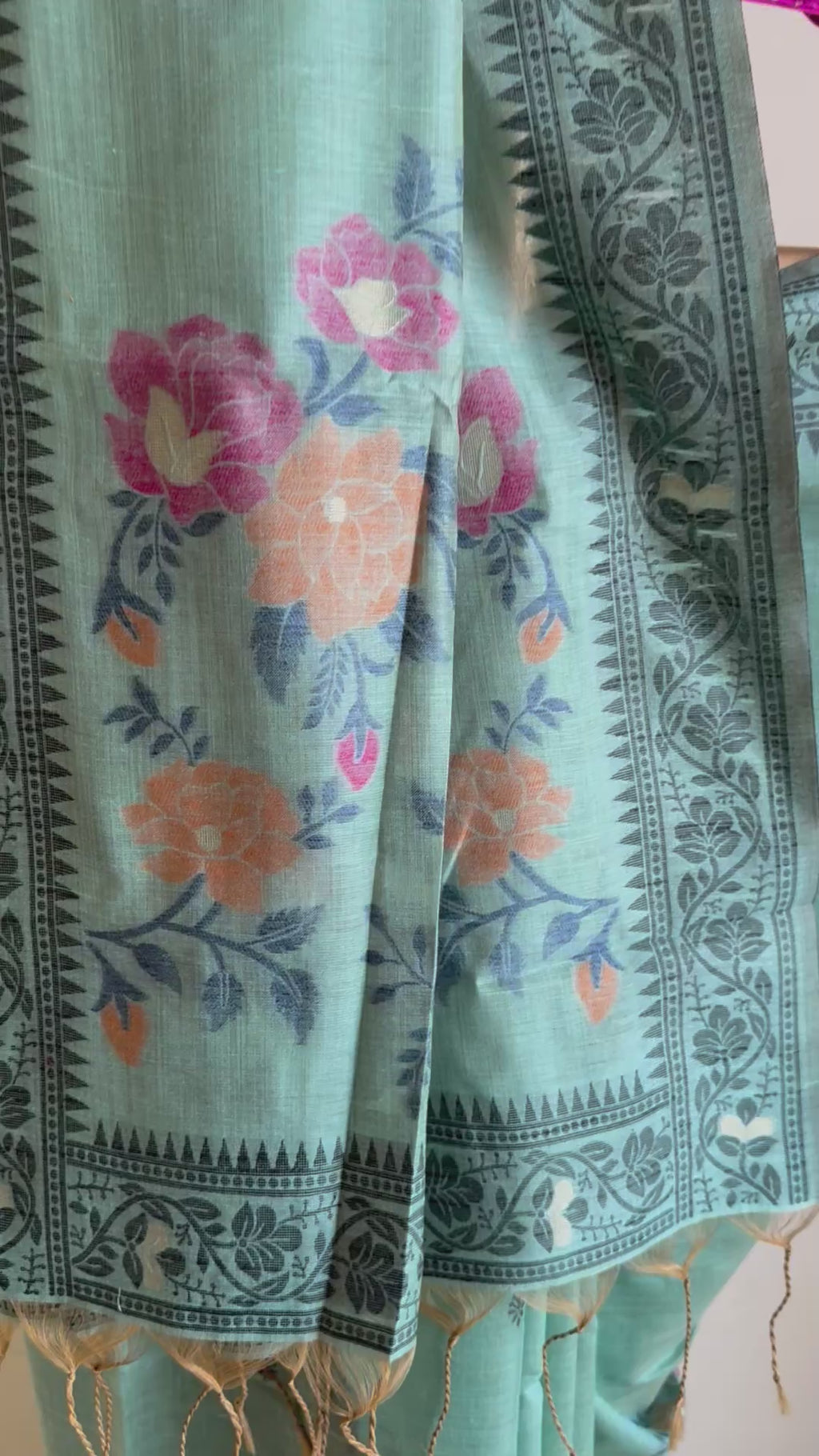 This beautiful blue finely woven cotton chanderi jamdani saree comes with a detailed border and woven delicate floral motifs all over. It is balanced with bigger floral motifs on the aanchal/palla. It is a thoughtfully designed saree for you women. It can be styled up or styled down. This saree feels like a second skin. Its light weight and feels like air.