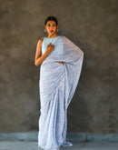 This Powder Blue Flowy and light georgette saree with a delicate small white floral print is accentuated with a white lace over all. The saree has delicate silver zari weave as well in the weave.