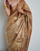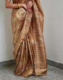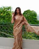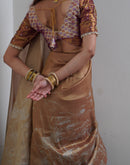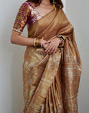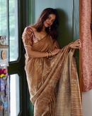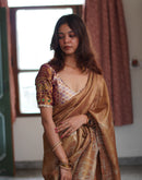 This mustard gold hue saree with a branchy effect over all on the saree is a saree for the modern lady who deeply values tradition. The saree is light subtle with no extra drama. The saree has an overall sheen to it. The saree is accentuated with a zari chain stitch over the motifs here and there. The print is its element of abstraction