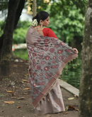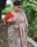 This beautiful and soft toned brown cotton chanderi saree is adorned with intricate lotus motifs scattered equally across the saree with a beautiful lotus stem design woven into the aanchal/palla.