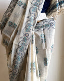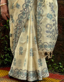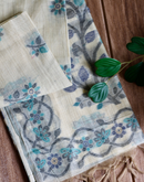 This beautiful yellow cotton chanderi jamdani saree have beautiful floral story all over its surface. The border also has a beautiful intertwining floral design, The saree is a beauty not to be missed. It is airy and allows unhindered functionality.