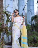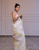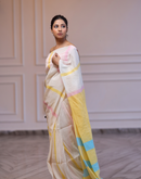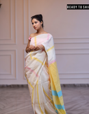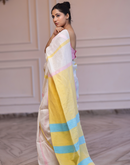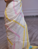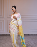 Cream coloured handwoven linen saree with multi-colored stripes and yellow aanchal. This saree is handwoven by women weavers from Phulia, West bengal. Crafted in pastel hues, this saree looks a daydream, perfect for any occasion.
