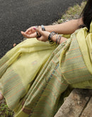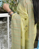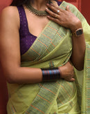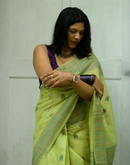 This breezy green cotton chanderi saree with multi color kantha stich technique is a no brainer saree. It compliments for an office meeting to an evening gathering. The saree highlight the beauty of minimal yet effective design.