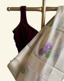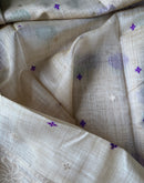 With beautiful woven lotus motifs all over and bigger lotus7 leaves motifs on the palla/aanchal this saree means purity. Balanced with a beige base color is a perfect for Oman saree. The playful and light feel to it makes it even more special