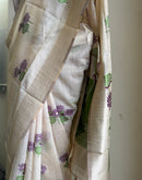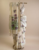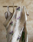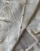 With beautiful woven lotus motifs all over and bigger lotus7 leaves motifs on the palla/aanchal this saree means purity. Balanced with a beige base color is a perfect for Oman saree. The playful and light feel to it makes it even more special