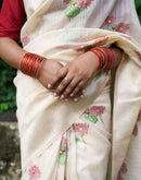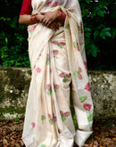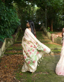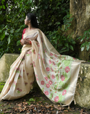 With beautiful woven lotus motifs all over and bigger lotus7 leaves motifs on the palla/aanchal this saree means purity. Balanced with a beige base color is a perfect for Oman saree. The playful and light feel to it makes it even more special
