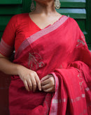 Handwoven linen saree crafted in dual tones of red and purple color with silver zari border and striped aanchal. This saree is handwoven by women weavers from Phulia, West bengal and is embroidered by our in-house team of artisans.