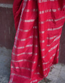 Handwoven linen saree crafted in dual tones of red and purple color with silver zari border and striped aanchal. This saree is handwoven by women weavers from Phulia, West bengal...
