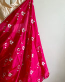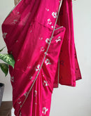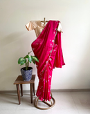 Hot pink saree with a beautiful floral hand print all over in a subtle sheen.This Saree is a sure shot head turner any-day anytime. A delicate lace runs across the saree adding to it's beauty.