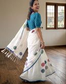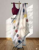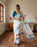 Polkas are classic! All seasonal! This linen cotton white beauty is a classic no brainer saree for your week days. East to drape super light it comes with a blouse...