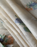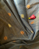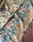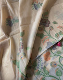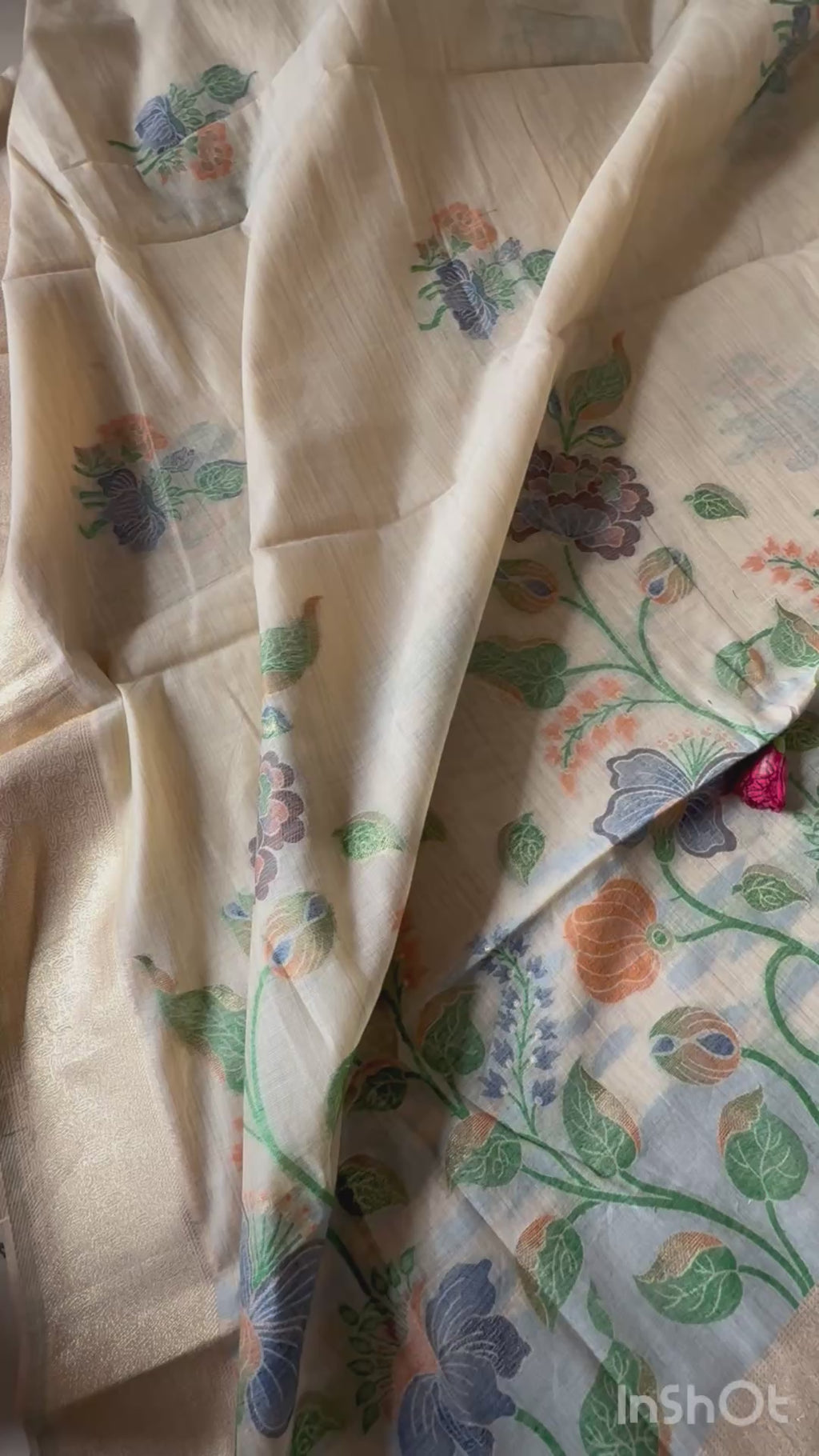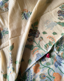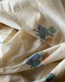 A beautiful beige chanderi saree with jamdani woven art like floral motifs is for the poised lady in you. The saree has a light gold zari border and playful tassels as details. A very fine saree for all you occasions