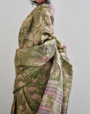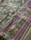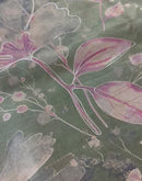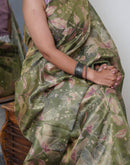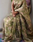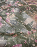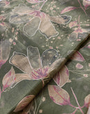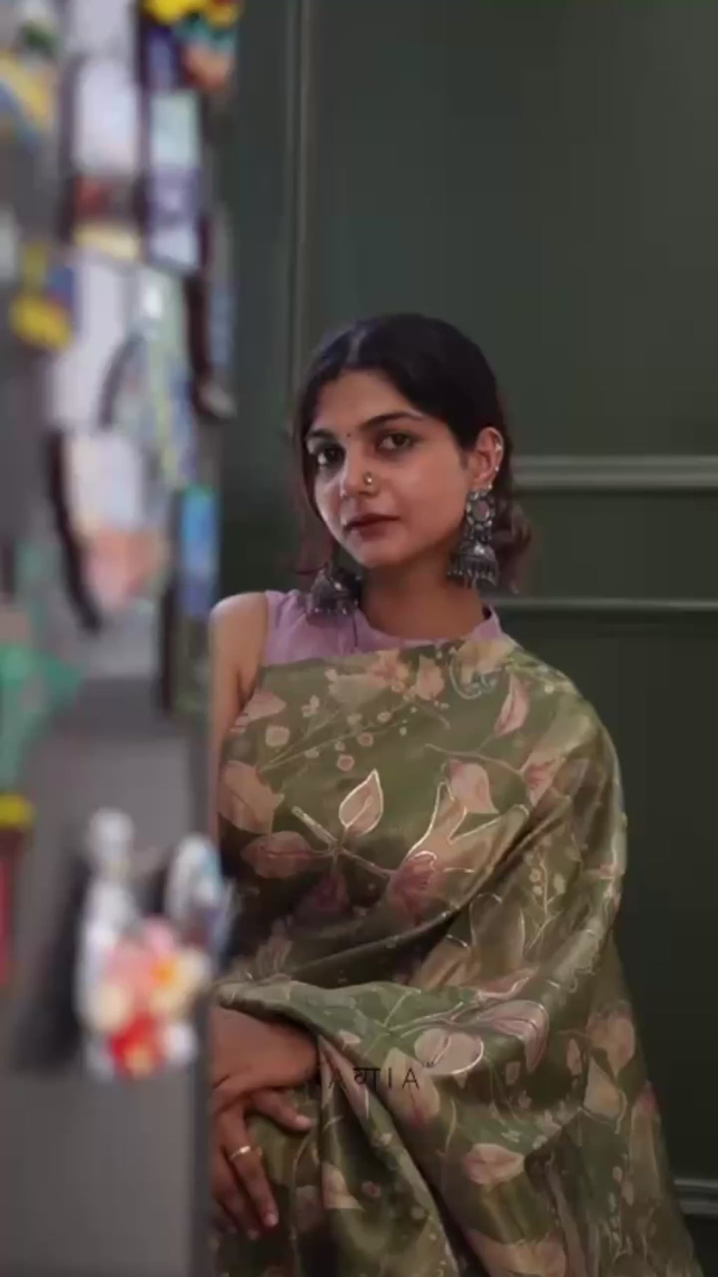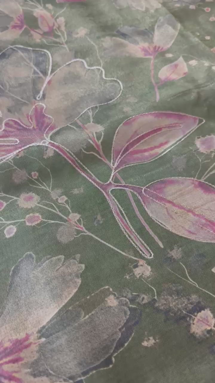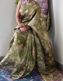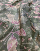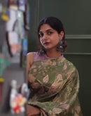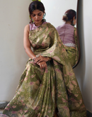 A beautiful green saree with a abstract floral print is highlighted with zari details to add to the over all effect. The saree has this dreamy print all over it. It is a thoughtfully design print for all your occasions. The meticulous print has a beautiful character to it and draping will only bring smiles.