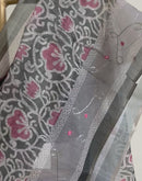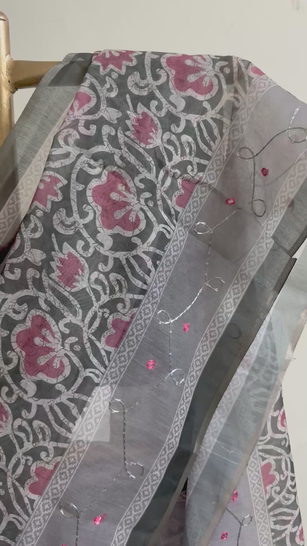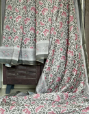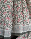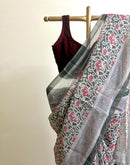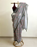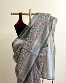 Beautiful depiction of a floral traditional overall floral jaal in soft hues of green and pink is a fuller saree which can be easily worn to the events and your day brunches and special gatherings. Its super light and breathable. We would love to see you sway in this one. The border has a special Resham and mirror detail to it.