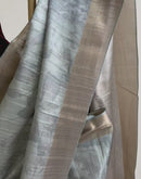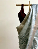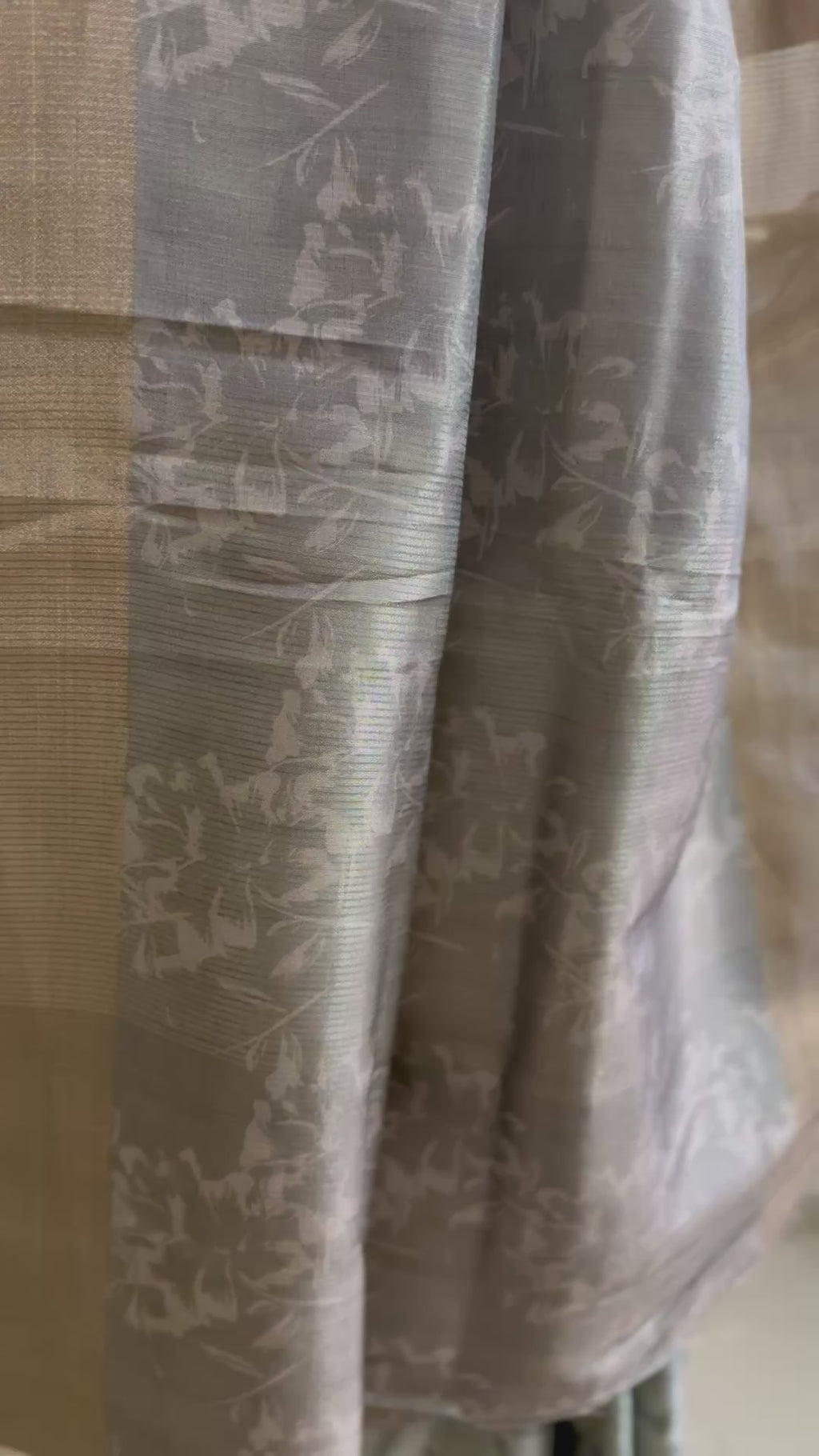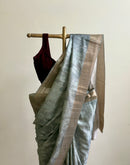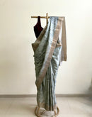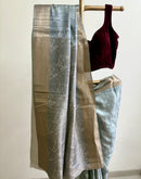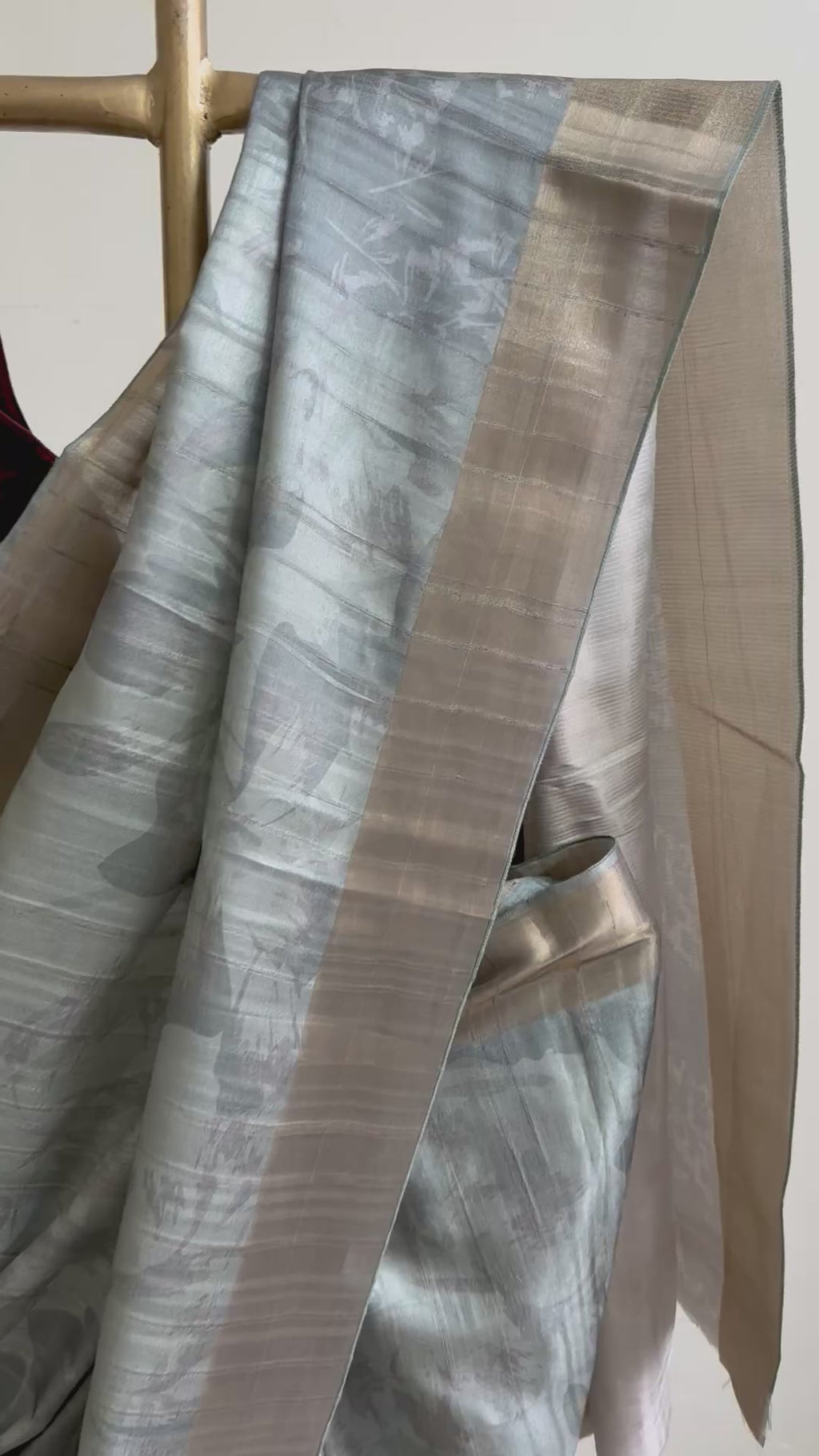 A beautiful and dreamy silk saree giving dual tones of green and grey subtly is for the women of Substance. It is light airy and rich in its texture. With a cooper gold border detail the saree gives a formal look. The smudgy and tonal print is its abstraction element
