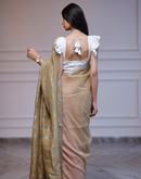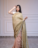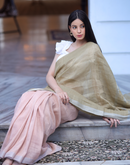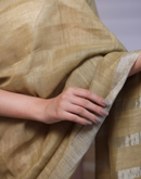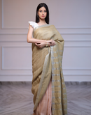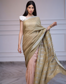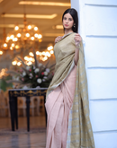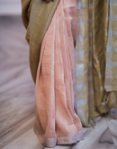 Handwoven linen saree crafted in dual toned summer pink and green colored base with silver zari border and striped aanchal. This saree is handwoven by women weavers from Phulia, West bengal.